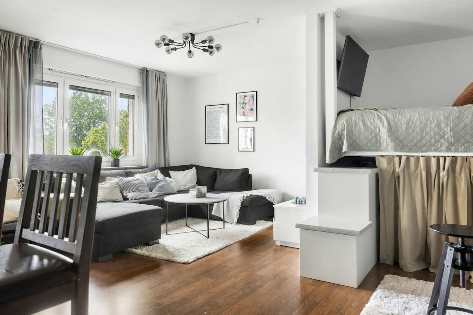 Vardagsrum i öppen planlösning mot kök. Sovalkov med uppbyggd väggfast säng med bra förvaringsutrymme under och plats för skrivbord bredvid sovalkov.