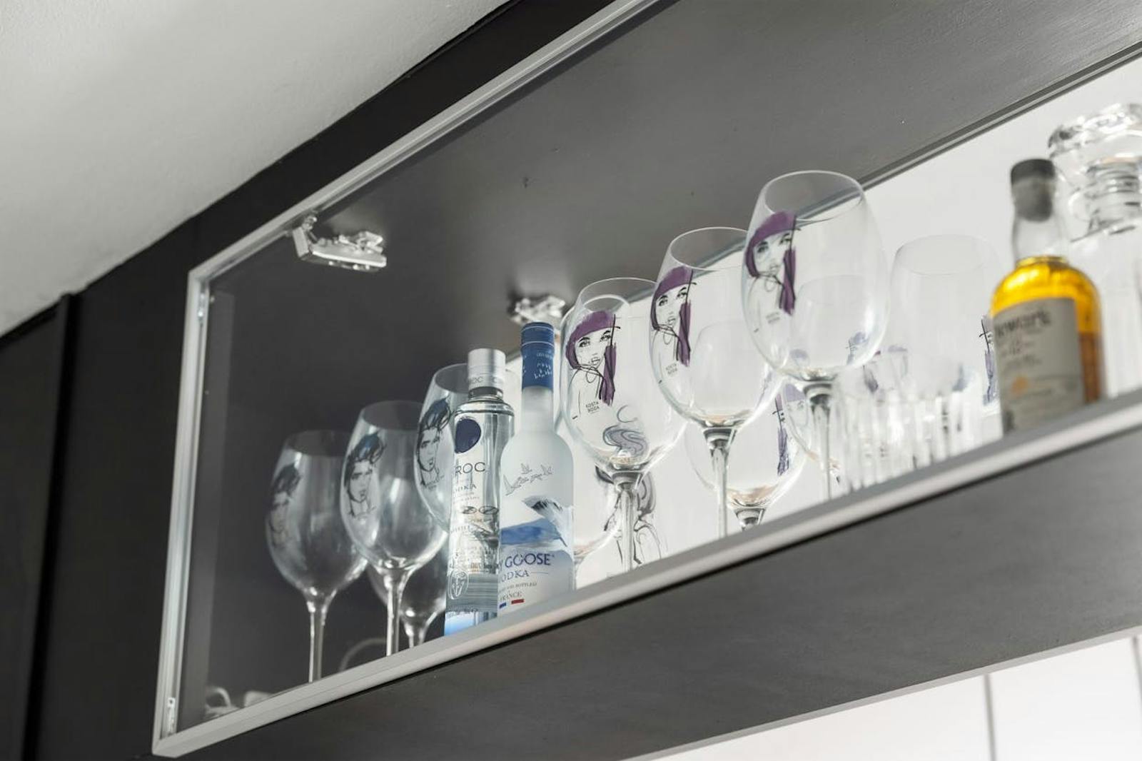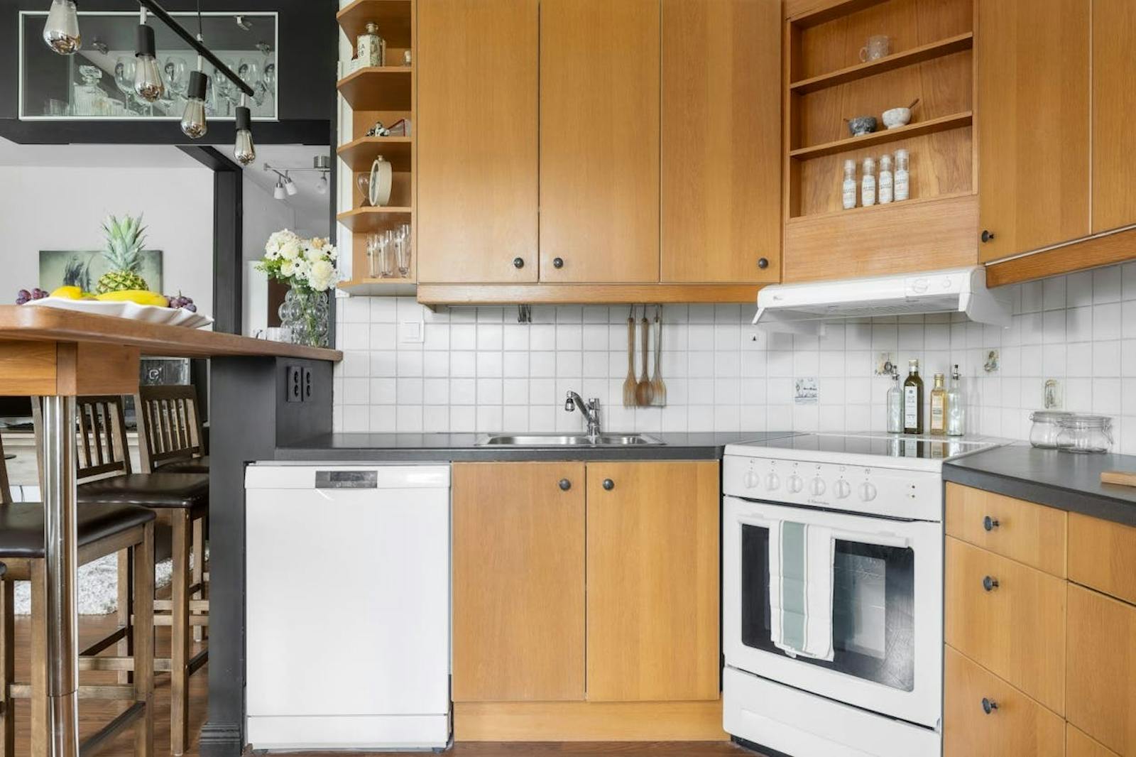 Kök med släta köksluckor i bok, grafitgrå bänkskivor, vitt kakel ovan bänkskivor, väggfast bar-bord med överskåp i vitrin. Diskmaskin, spis med häll, köksfläkt, kombinerad kyl med mindre frys.