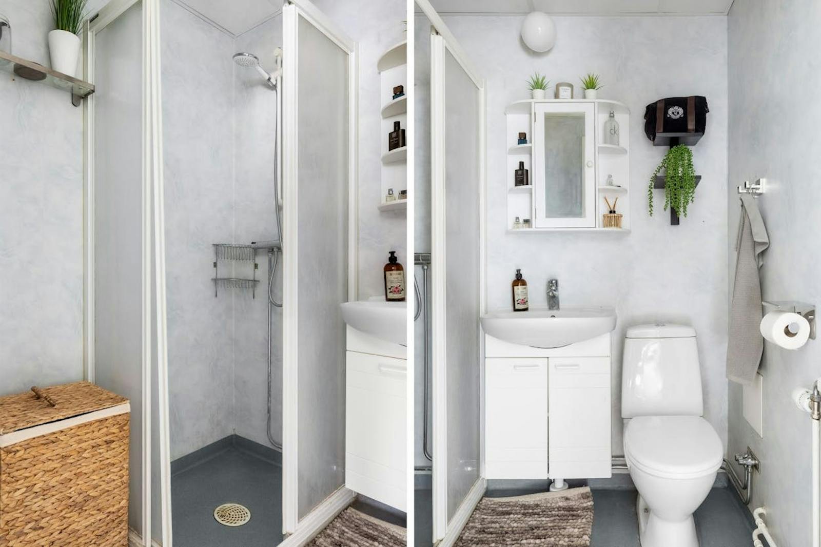 Wc/dusch med grå våtrumsmatta och ljus våtrumstapet. Duschkabin, handfat i kommod, wc-stol.