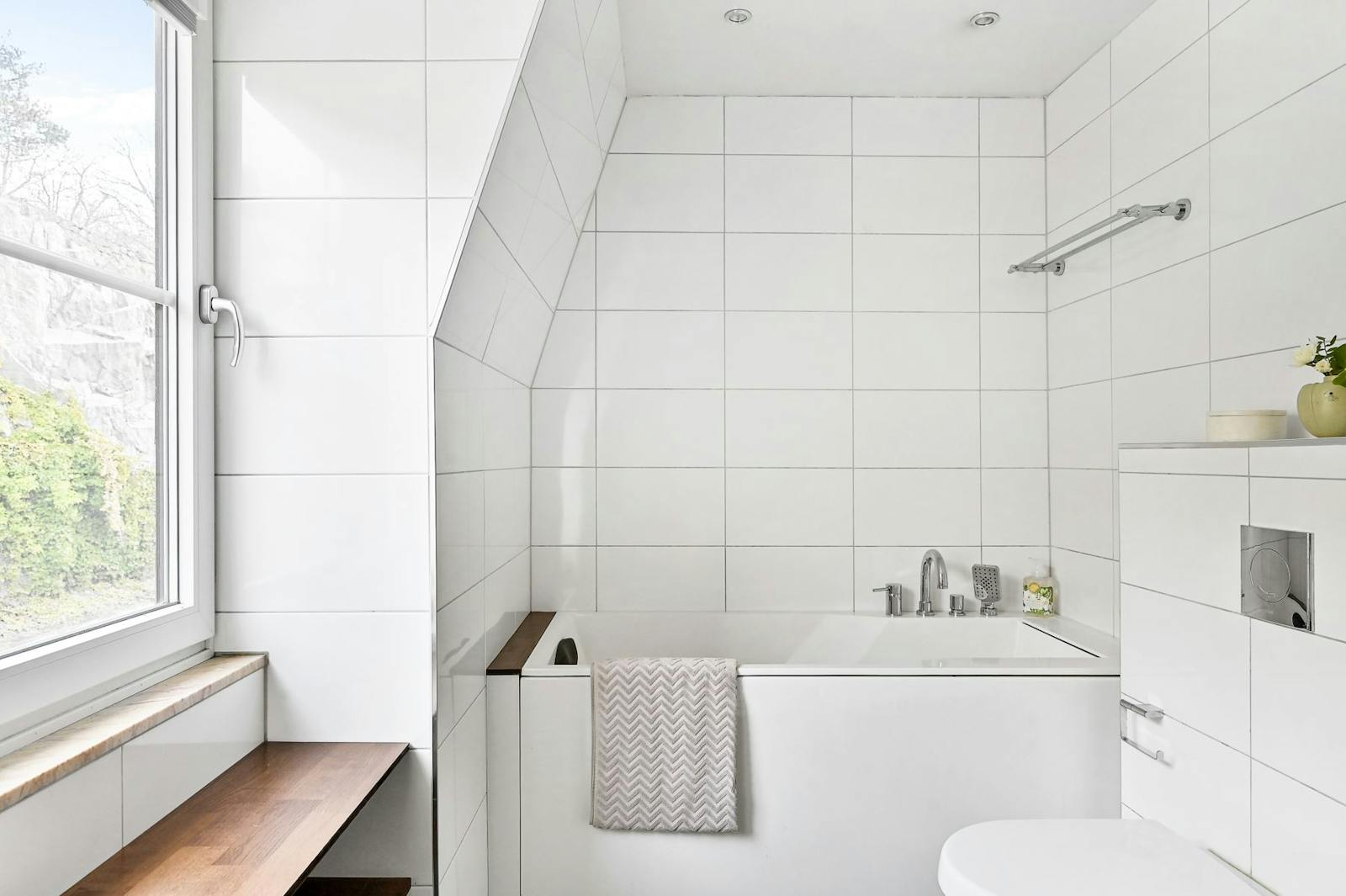 Modernt och väl tilltaget badrum med fönster. Helkaklat med grå klinkers och vitt kakel, golvvärme, badkar samt stort handfat med kommod i valnöt.
