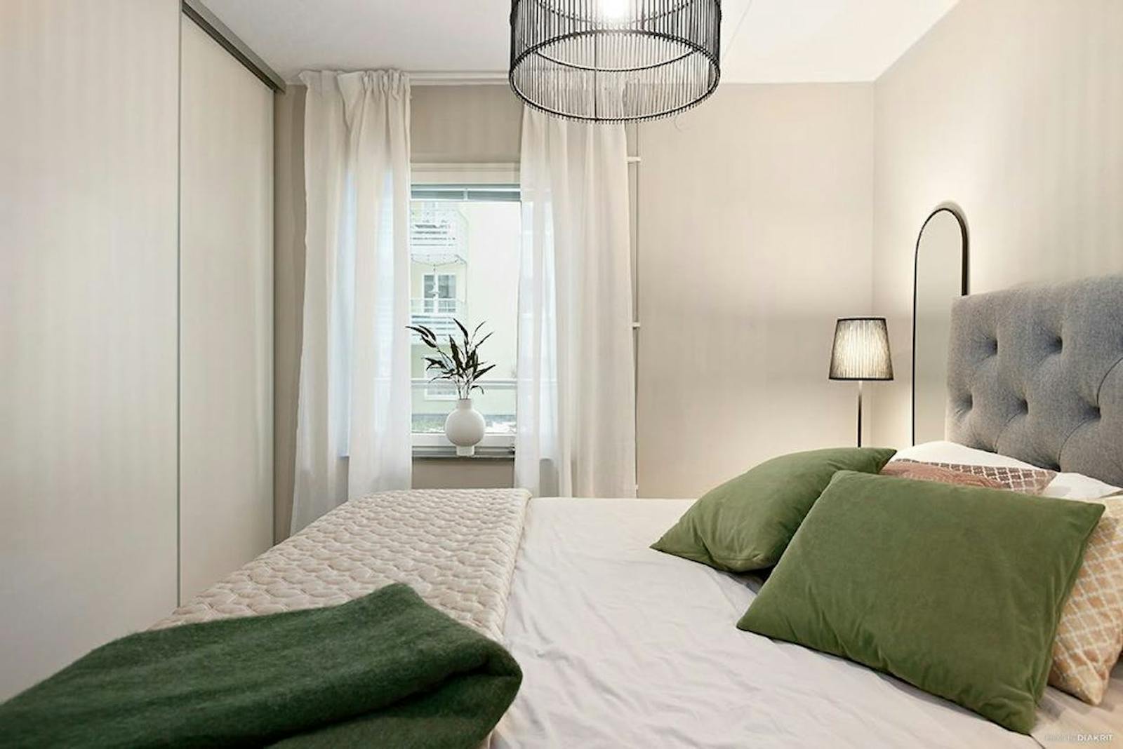 Sovrummet är rymligt och rogivande med plats för en stor dubbelsäng och sängbord. Två platsbyggda garderober med skjutdörrar erbjuder mycket god förvaring och bidrar till en ordnad och harmonisk känsla.