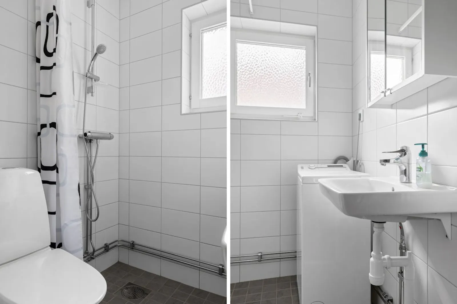 Helkaklade vita väggar och grått klinkergolv med golvvärme (el). Här finns wc, handfat, dusch och toppmatad tvättmaskin.