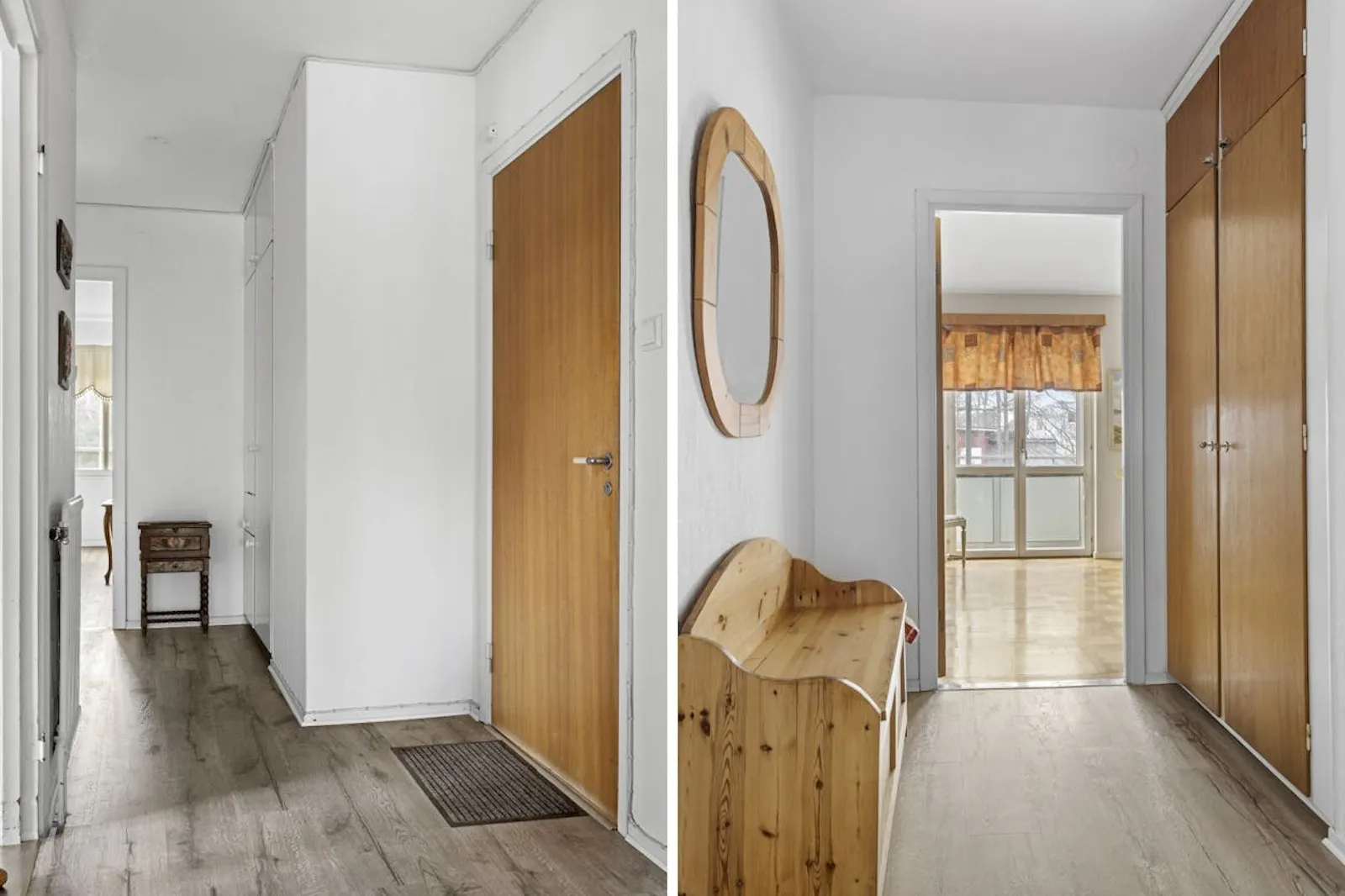 Grått laminatgolv, vita väggar och vitt tak. Stor hall med gott om förvaring och flera garderober.